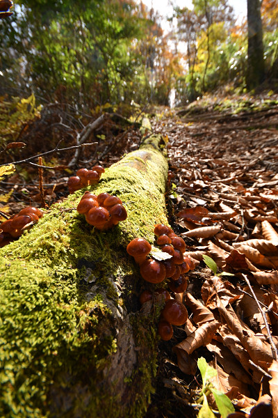ろう。足元の古い倒木にナメコの幼菌が出ていた。