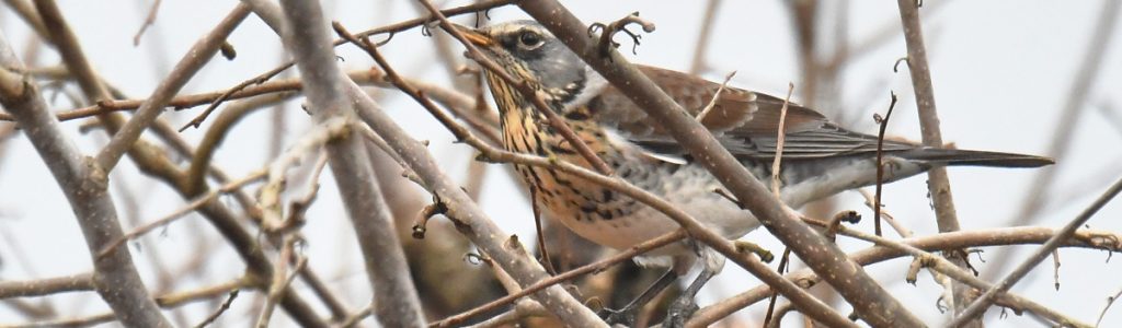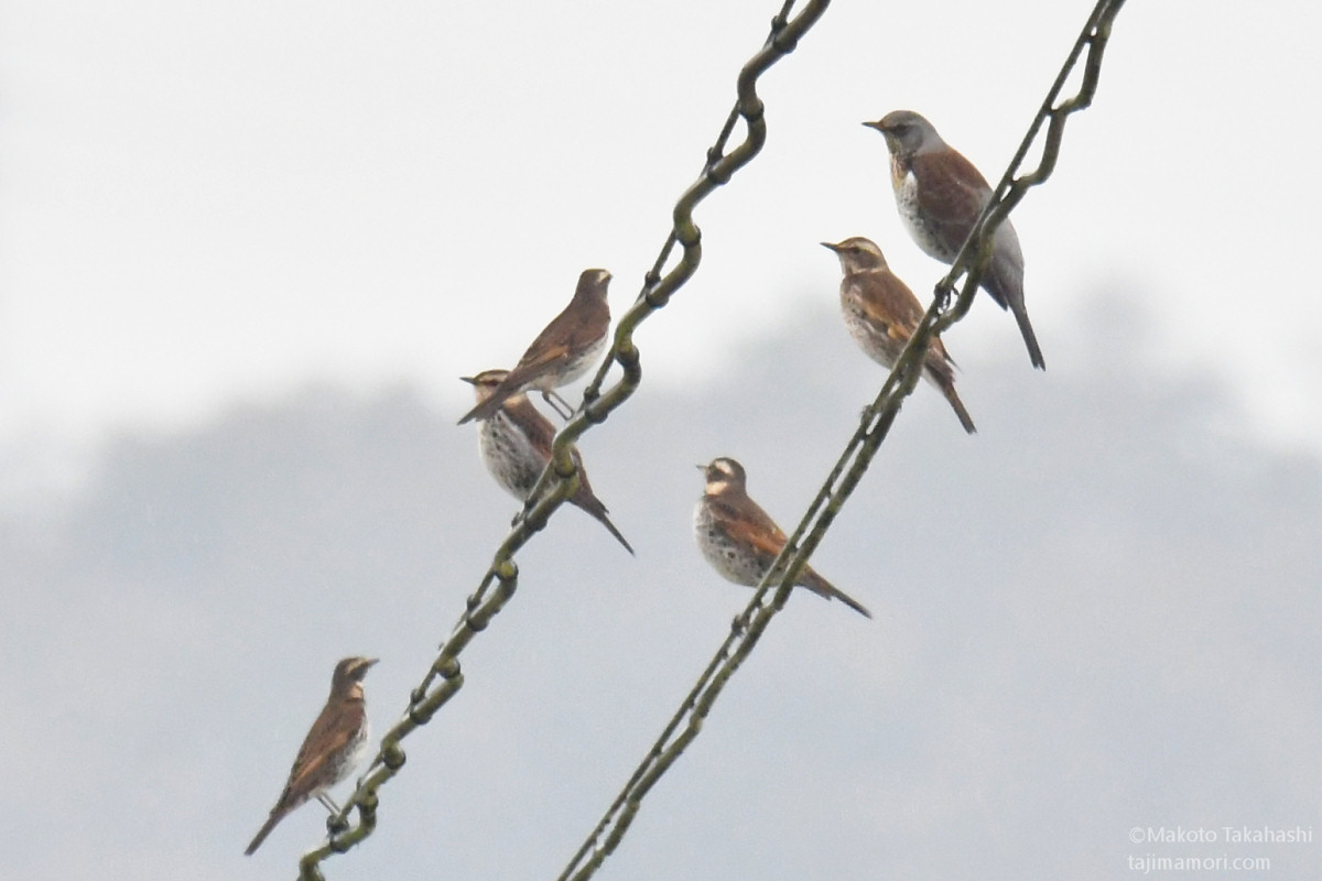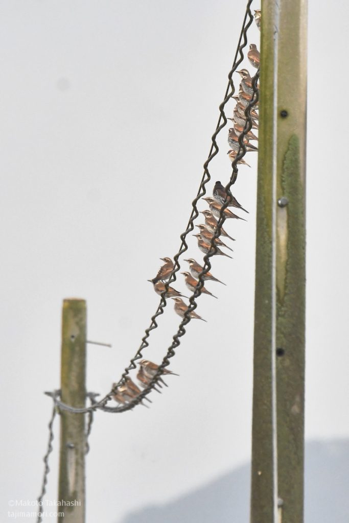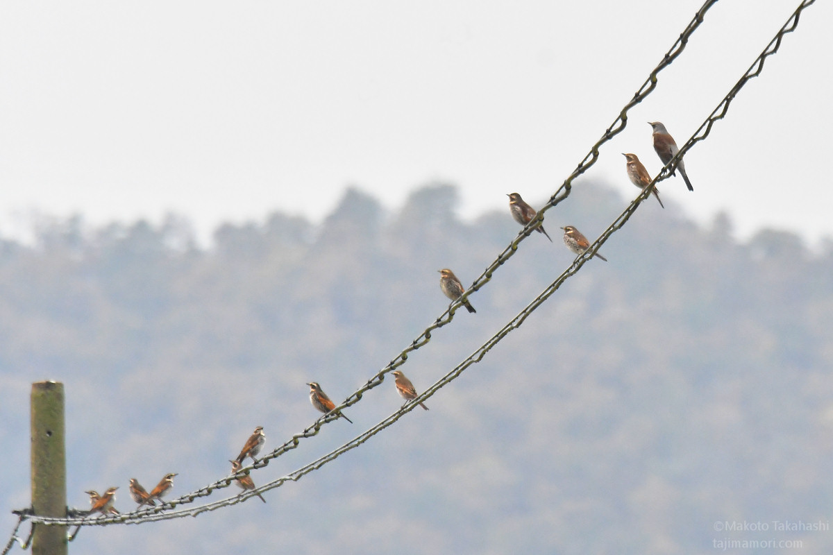 そんなツグミの大群の中に、変わった1羽を仲間が偶然発見した。電線に一列に並んだ中に、ひときわ大きな個体を見つけたのが、今回紹介するノハラツグミ(第1回冬羽)である。私は仲間が撮影した翌日に、同じエリアで運よく遭遇して撮影がかなったものである。ノハラツグミはヨーロッパの鳥で、日本での観察はごくまれな迷鳥。シベリア北部の生息地が重なったあたりから、ツグミの日本への渡りの群れに紛れ込んで来たものと推測される。兵庫県初観察種となるようである。