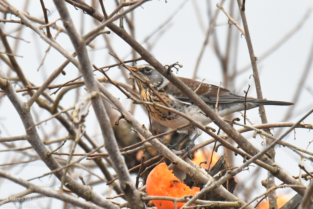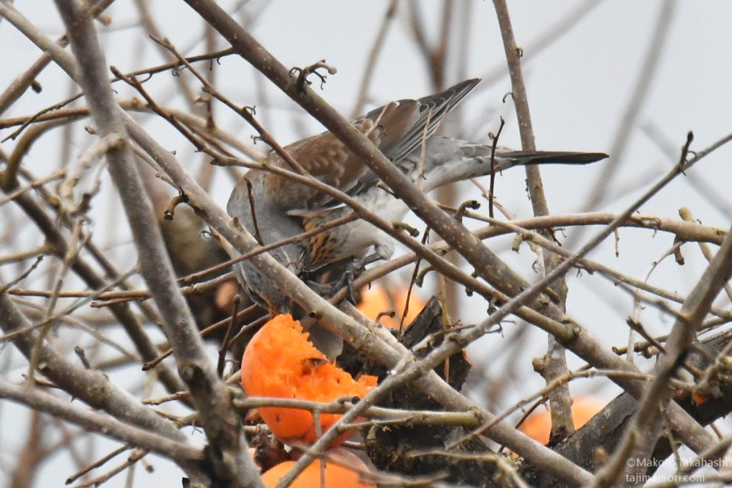 今季はツグミがやたら多い。渡来数の多少は年毎に違うが、渡来してもこの時期にはまだ山の上に留まったままのはずのツグミが大挙して平地で群れている。今秋は山の木の実は豊富にあるはずだが、里地の柿も大豊作で、柿の実にツグミが集まっている。