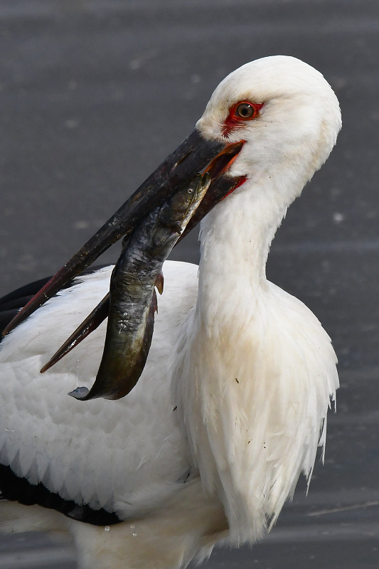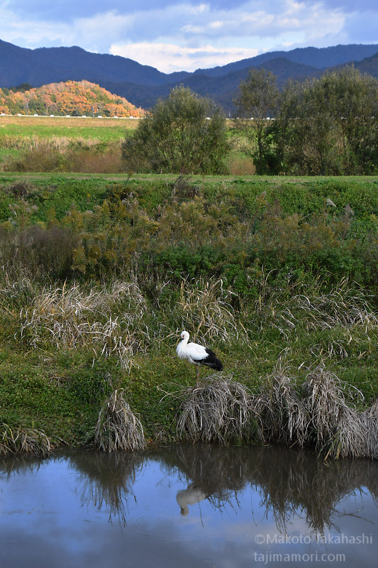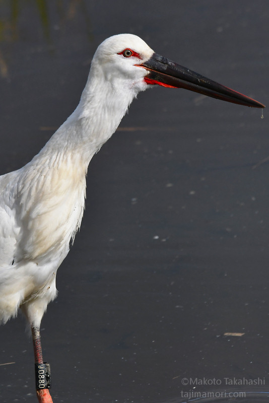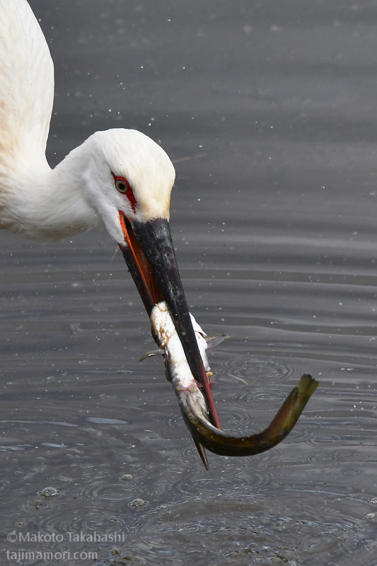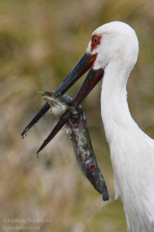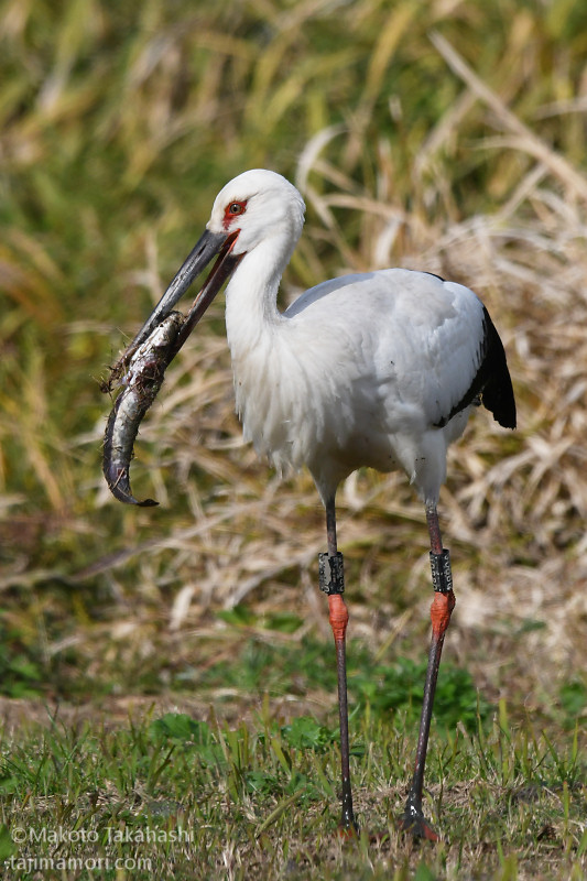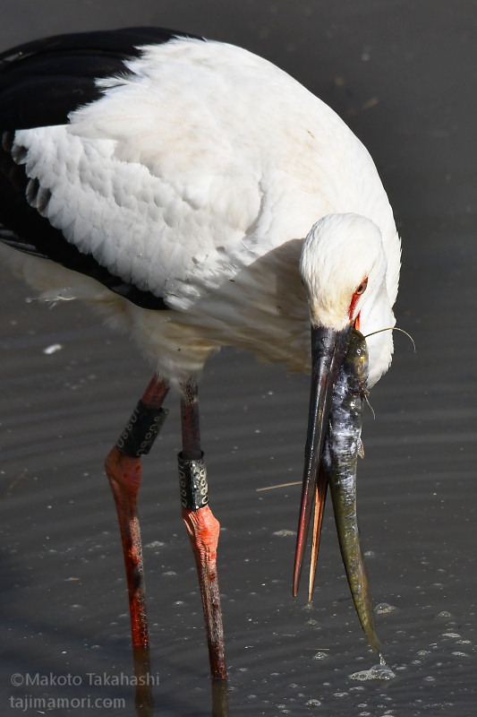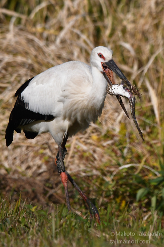 J0880は解放場所から1kmほど北の農地を中心に逗留を続け、そこを拠点に出石川堤外の本流や加陽湿地で採餌を続けている。加陽湿地の三木川につながる開放湿地で、J0880が大物を仕留めた。自分のくちばしの長さを超える30cm級のナマズ。水中で最初の一突きをくらわせた後、獲物をくわえて草地にあがり、なんどか落下を繰り返してナマズを弱らせた。草と泥に汚れたナマズをくわえて再び水の中に入り、汚れを落としたあと、苦労しながらようやく丸のみした。
