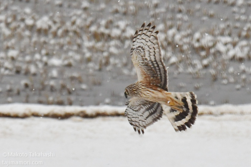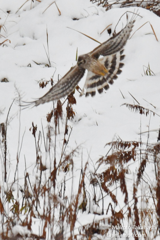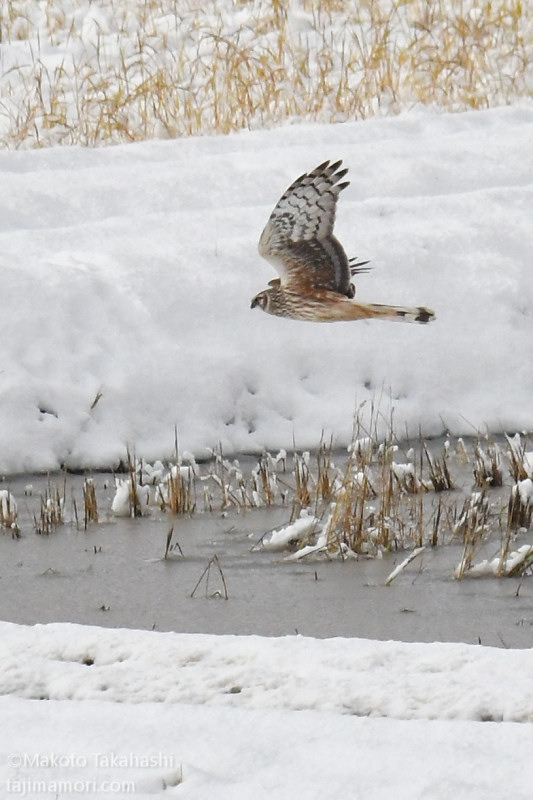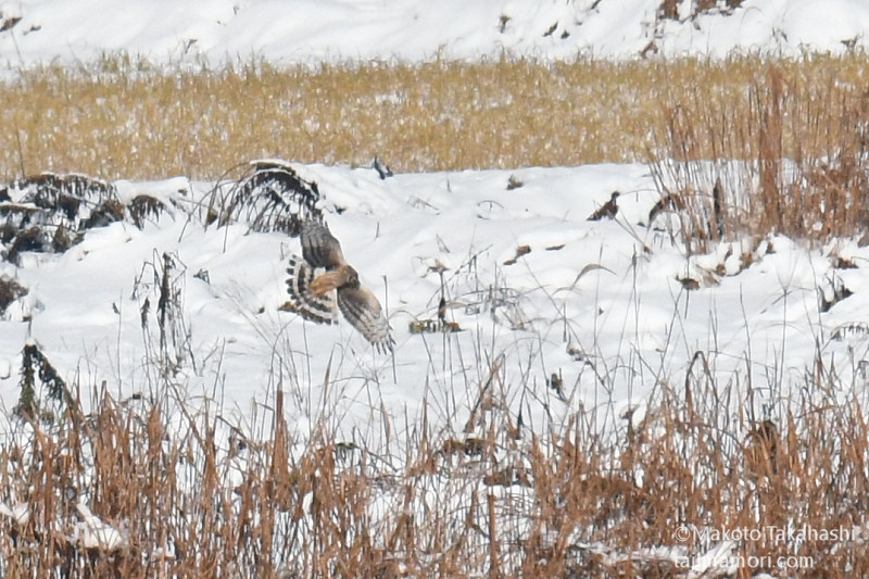 何度も遭遇しながら、遠い豆粒のハイイロチュウヒ(以降ハイチュウ)しか撮影できないでいたが、お正月のお年玉がやって来たのか、少し接近したハイチュウの姿をとらえることができた。根雪となって雪田が続くようになれば、どこからともなくこつ然と、ハイチュウのオスがやってきそうなものだけど、今シーズンの登場は未だ無い。