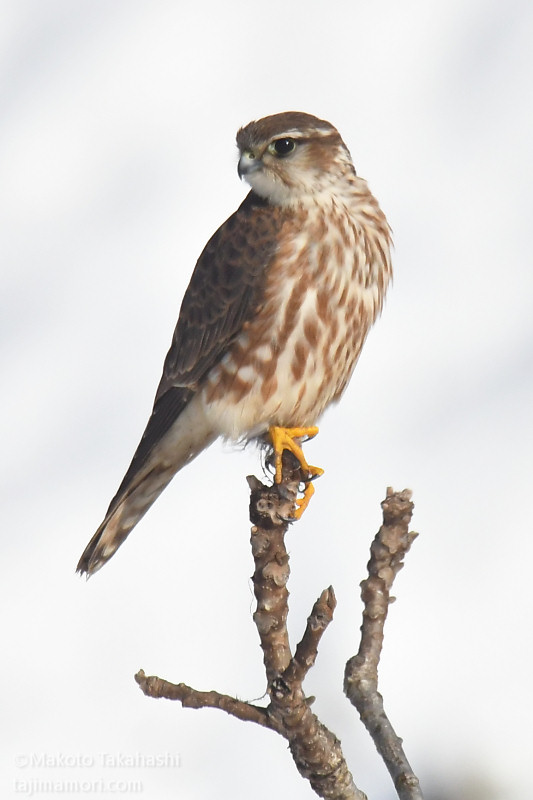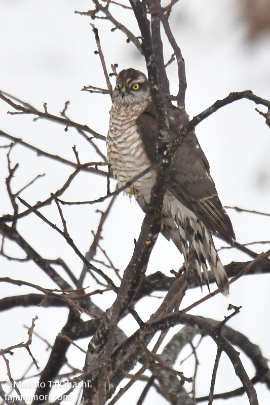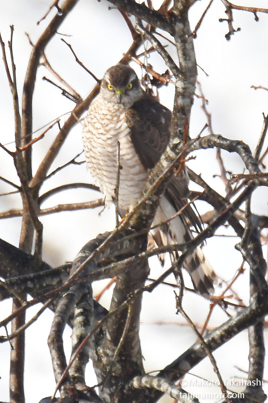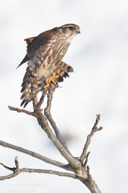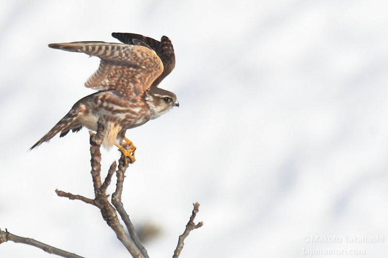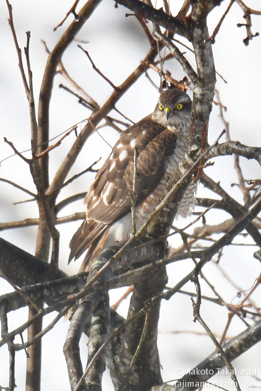 コチョウゲンボウが獲物を食べ始めてまもなく、今度はハイタカ幼鳥が飛んできて止まった。コチョウゲンボウは必然的に追い出され、しばらくハイタカが休憩して行った。