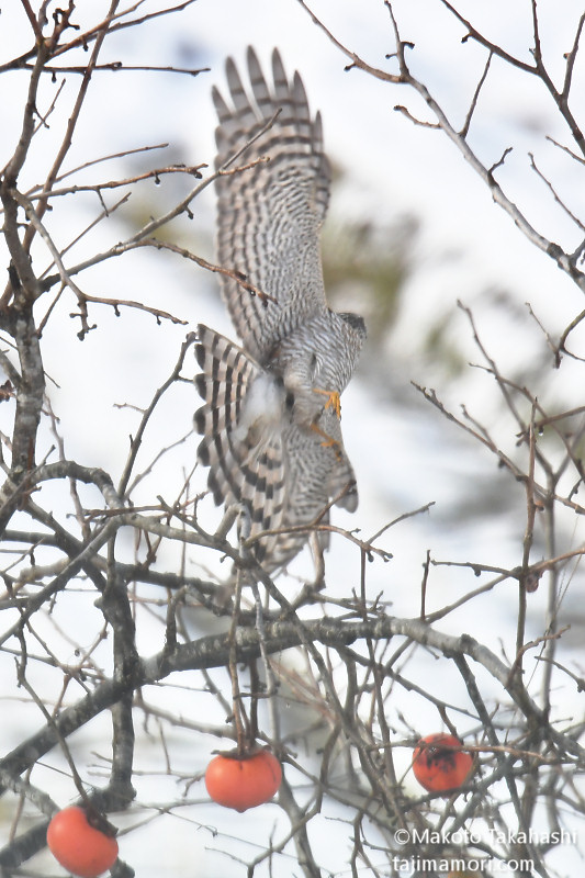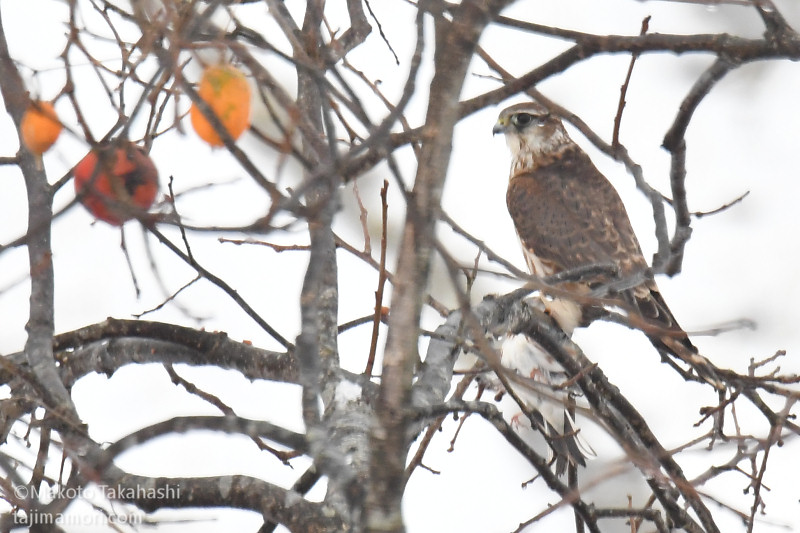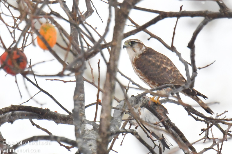 最初に柿の木に飛来したのはコチョウゲンボウ♀だった。超高速で隣接のブッシュに突っ込んだあと、枝に止まった。最初は気づかなかったが、足にはしっかりと獲物が掴まれており、やがて落ち着くと、羽をむしって食べ始めた。獲物は尾羽しか明瞭に見えず識別は自信がないが、ホオジロ科の尾羽には間違い無いと思われ、腹が白く胸に赤茶色の斑が少し見えることから、おそらくであるが、カシラダカではないかと思った。