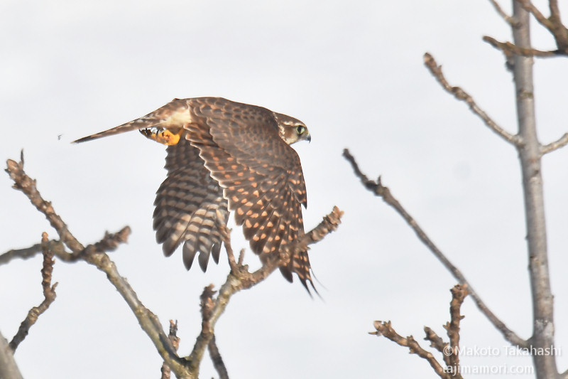 ハイタカが柿の木から飛び去ったあと、ふと堤外のクルミの木をみると、先程と同個体と思われるコチョウゲンボウ♀が止まっていた。車の中から観察を続けるとすっかり寛ぎモードに入った様子で、長い間、羽繕いしたり伸びをしたりしたあと、上流に飛び去った。