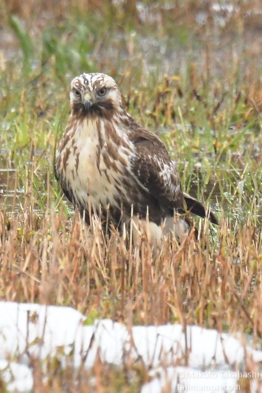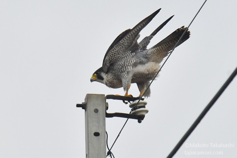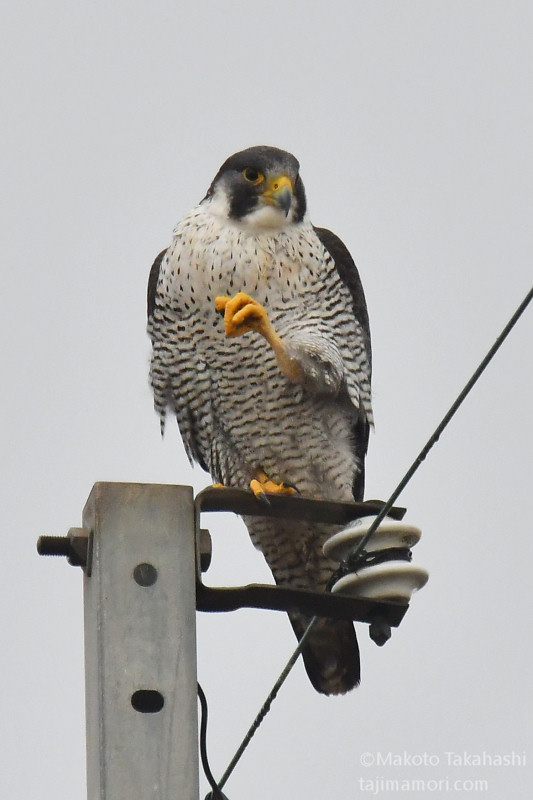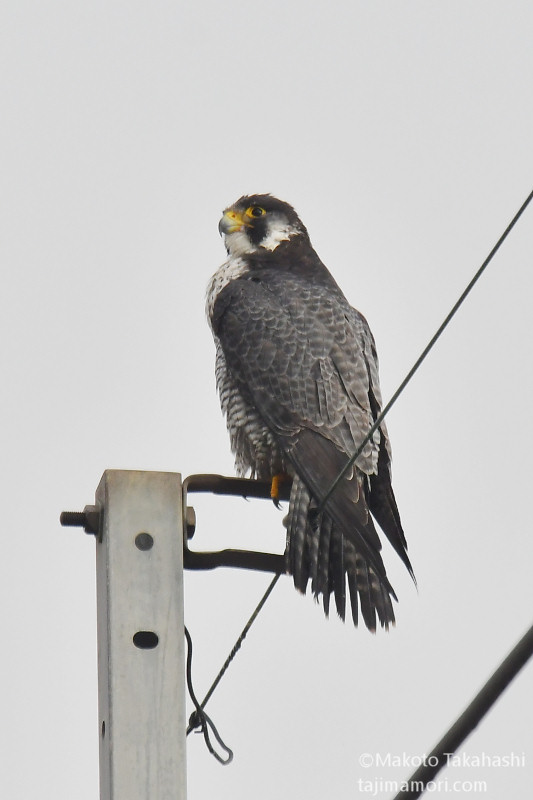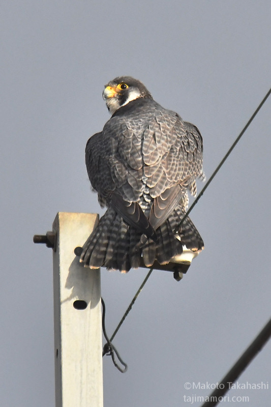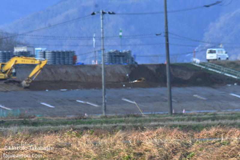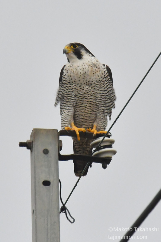 六方田んぼの電柱列にハヤブサが止まっていた。そ嚢を大きく膨らませて、食事の直後のまったりタイムの様子。大きさと胸の縦斑の様子から成鳥メスと思われた。例年に比べ今冬は小鳥の数が少ないので、ハヤブサも狩りに苦労しているのかもしれない。
