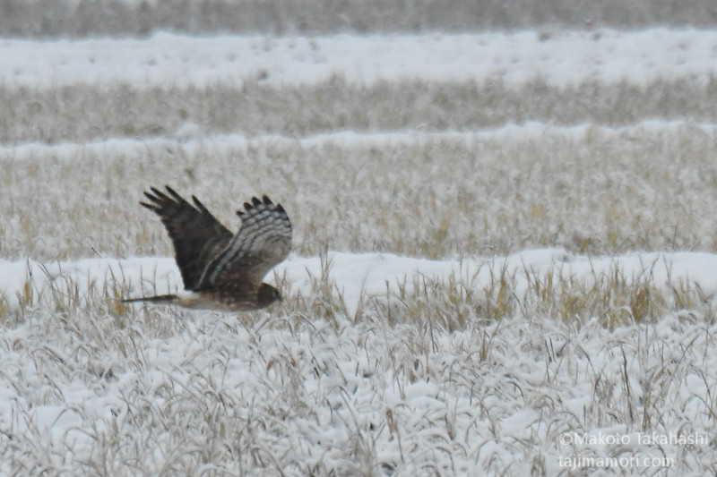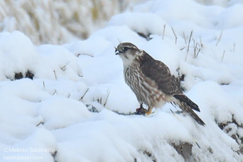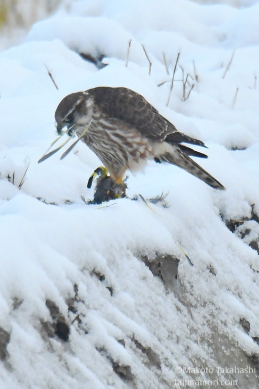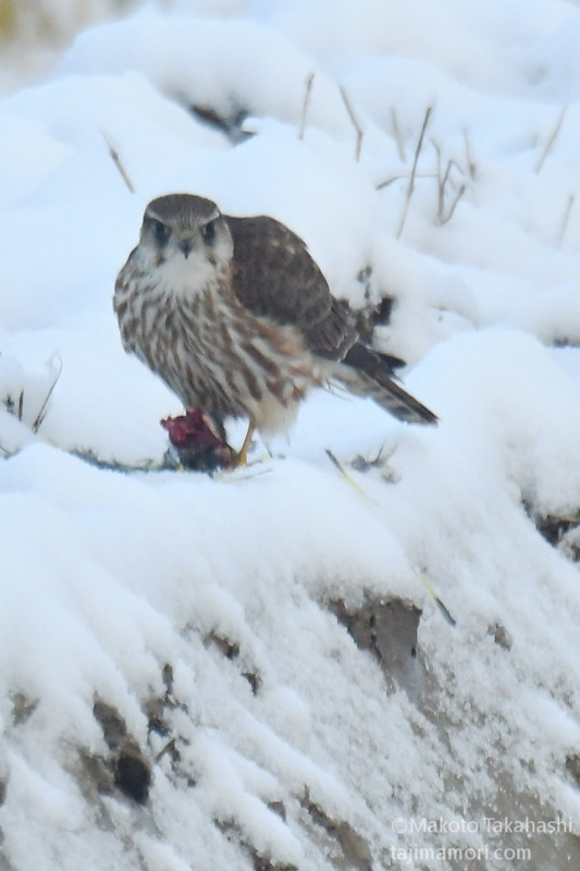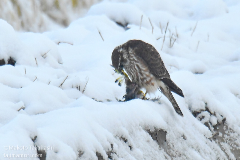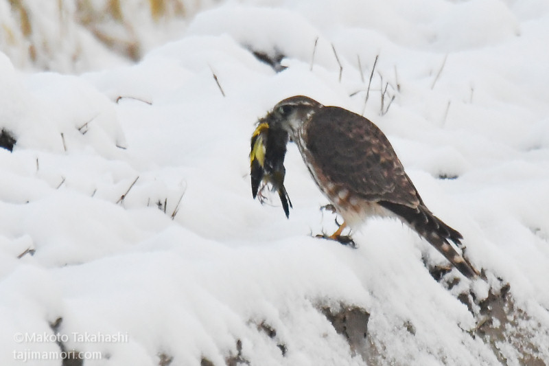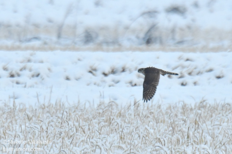 コチョウゲンボウの朝食 tajimamori2026年1月16日野鳥 20cmほどの積雪となった。林縁に小物が出てこないかと期待して巡回するが、なにも出てこず。朝一番で路肩から獲物をくわえて畦に飛んだコチョウゲンボウの捕食シーンが、この日のハイライトとなった。猛禽類はそこそこ登場するものの、冬の小鳥たちはどこに消えてしまったのか。はたまた、今冬は当地での越冬をやめてしまっているのか。さっぱり事情がわからない。 コチョウゲンボウの獲物はカワラヒワだった。 J0014 ハイイロチュウヒ チョウゲンボウ 2026.1.9 D7500+VR300mmF4.0 Post Views: 40 2+ 投稿ナビゲーション 前の記事:ハヤブサとハイタカ♂