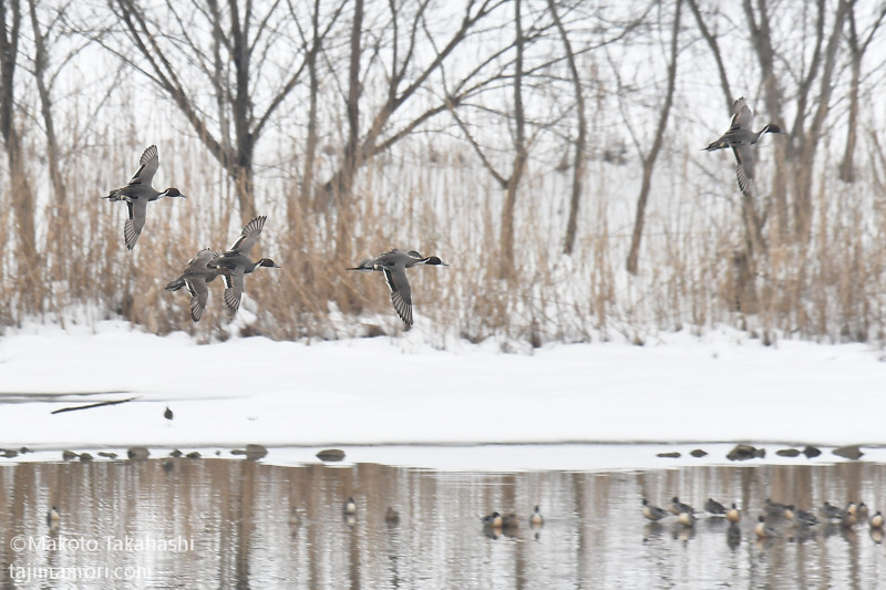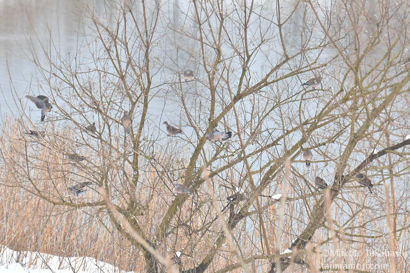 コハクチョウのほかにオナガガモを中心に何種類かのカモ、岸辺にはタゲリなどの姿も見える。河川敷のナンキンハゼの木の実には、たくさんのキジバトが群れている。