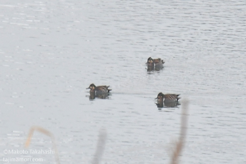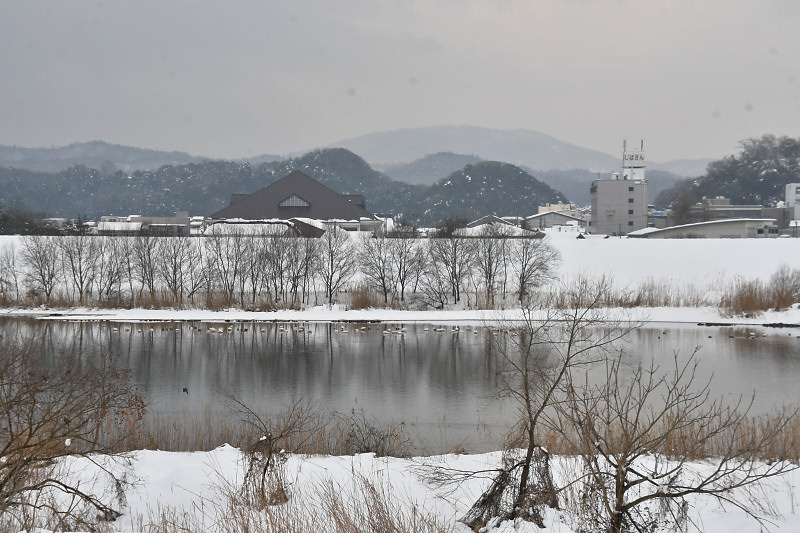 大雪のため、ひこばえの田んぼでの採餌が不可能になって時間が経つ。鳥たちは盆地中央を流れる円山川の浅瀬に集まって、水草などをたべてしのいでいる様子。コハクチョウは54羽をカウントしたり、57羽だったり、背中にくちばしを入れて眠っている白い塊を雪景色の中でカウントするのが難しい。北の水田で越冬に入っていたオオハクチョウ3羽も、この群れの中に混じっているのだろうか。