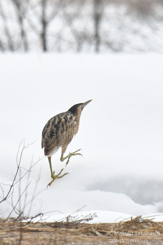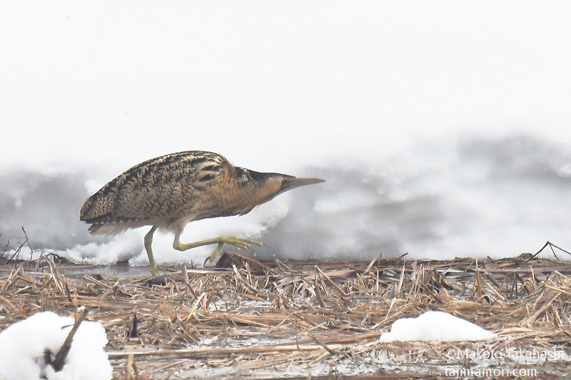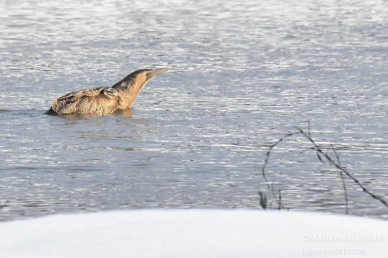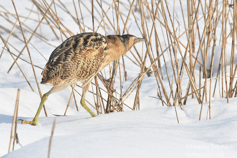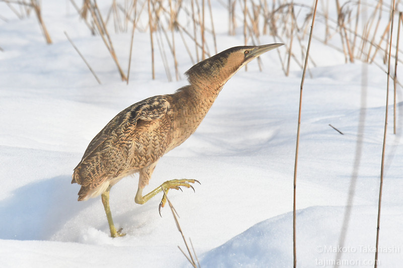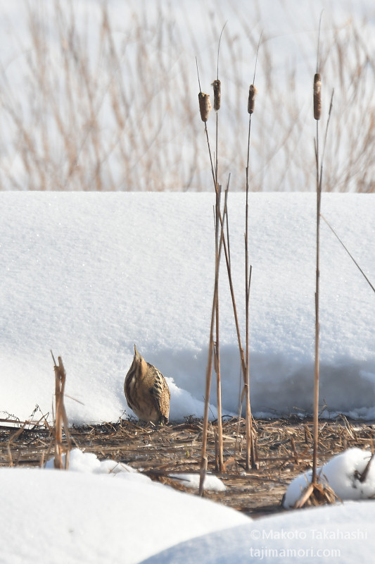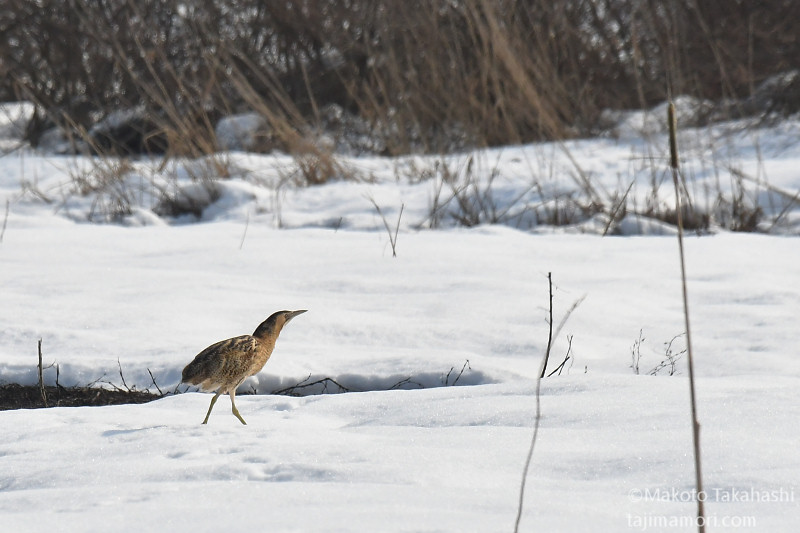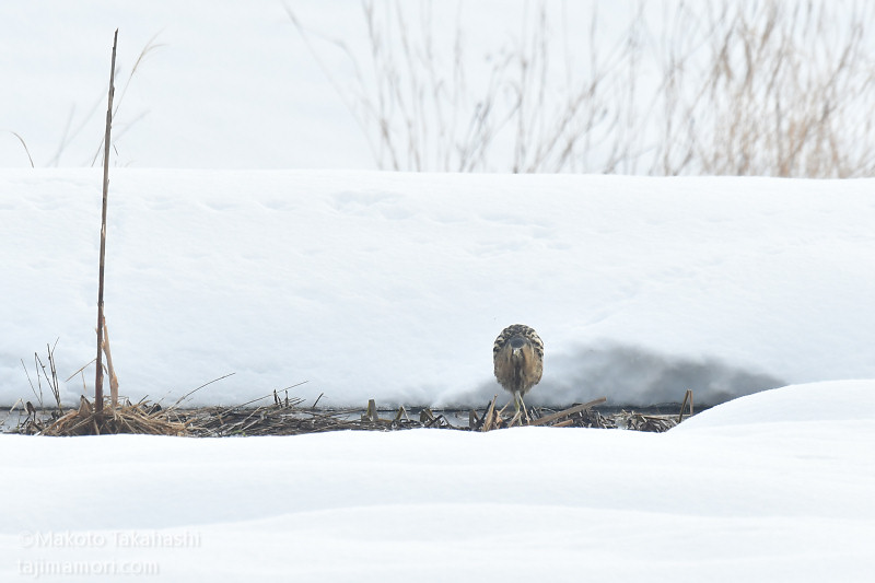 朝早い時間、湿地巡回中の仲間からサンカノゴイ発見のコールがあり、すぐ近くで待機していた私もさっそく合流。もう一人の仲間も呼んで、3人でひさしぶりのサンちゃん観察となった。相手の動きをみながら、警戒心の具合をチェック。大雪で空腹なのと、身を隠すヨシ原が埋もれているのも要因か、強い警戒心を見せない。雪原をツボ足で歩いて距離を縮め、限界を超えたところで下の湿地に少し飛んで見えなくなった。