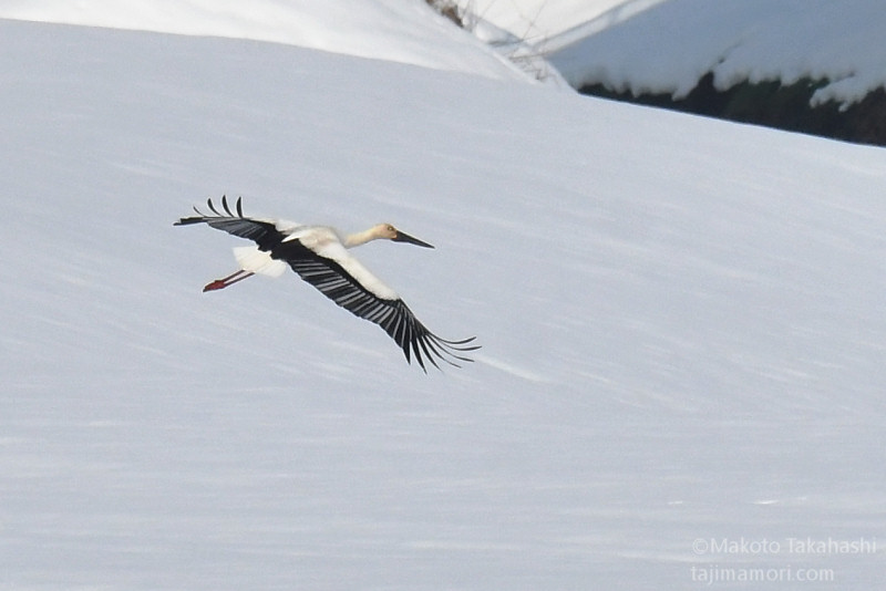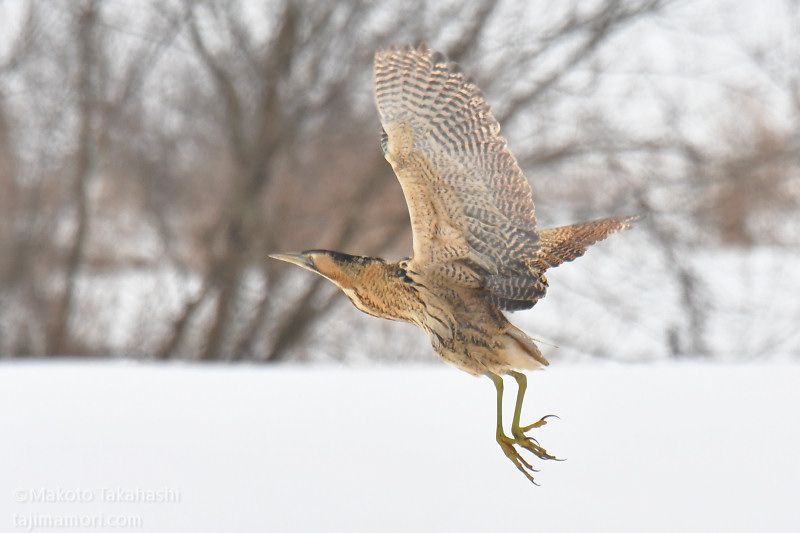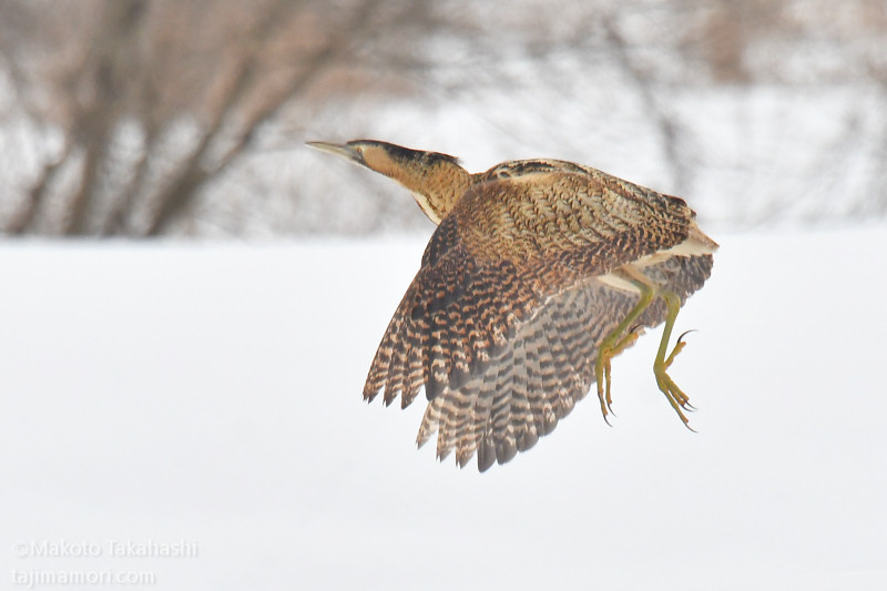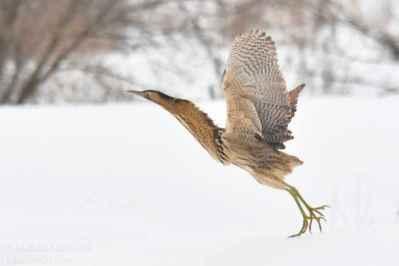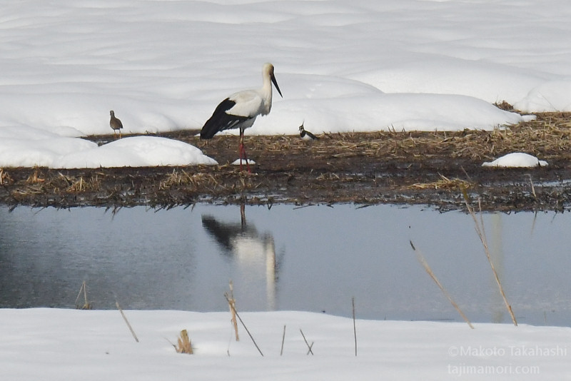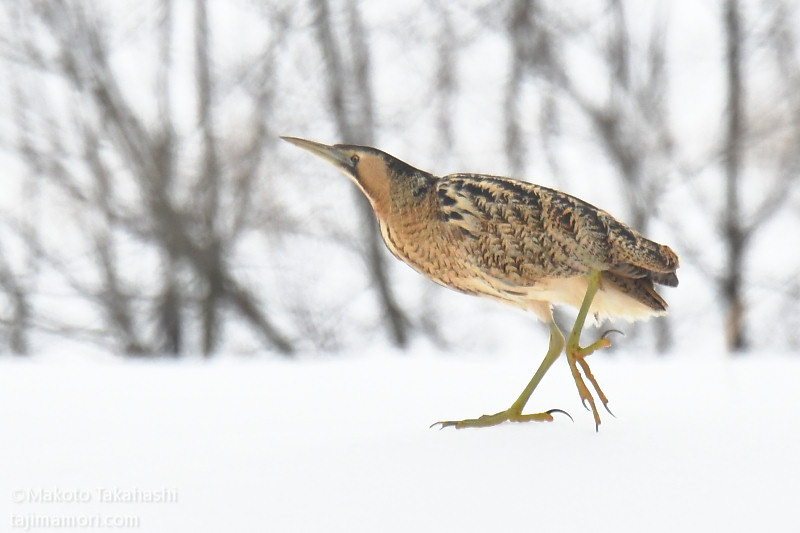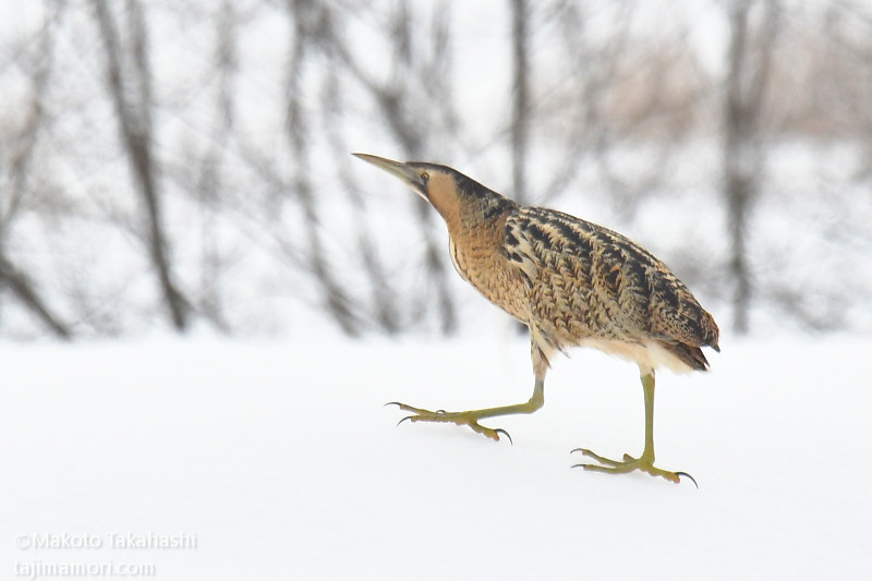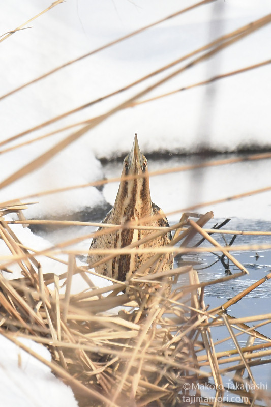 朝早い時間、湿地巡回中の仲間からサンカノゴイ発見のコールがあり、すぐ近くで待機していた私もさっそく合流。もう一人の仲間も呼んで、3人でひさしぶりのサンちゃん観察となった。相手の動きをみながら、警戒心の具合をチェック。大雪で空腹なのと、身を隠すヨシ原が埋もれているのも要因か、強い警戒心を見せない。雪原をツボ足で歩いて距離を縮め、限界を超えたところで下の湿地に少し飛んで見えなくなった。