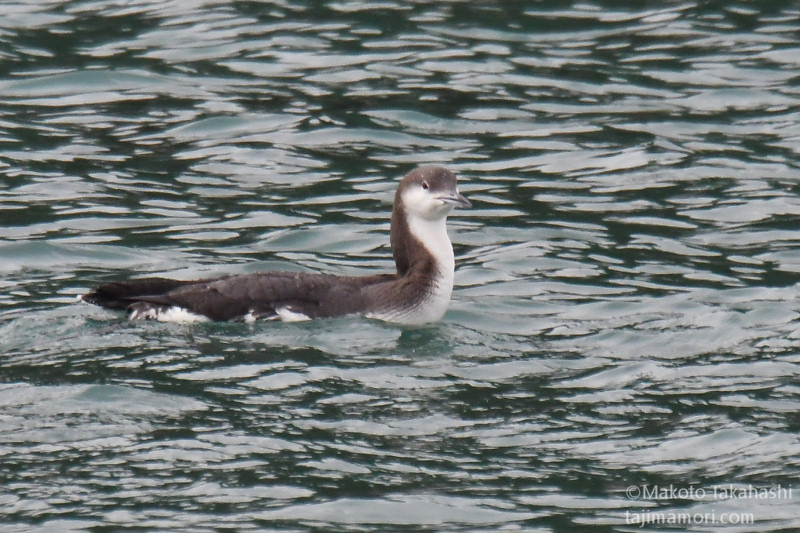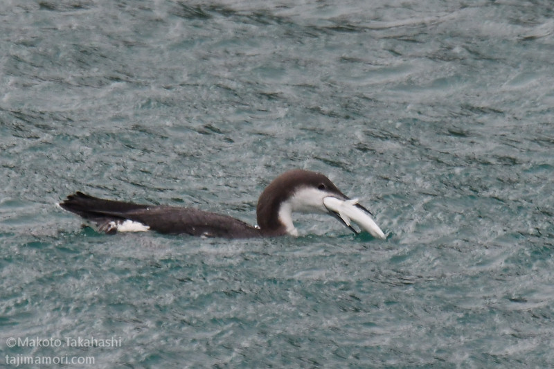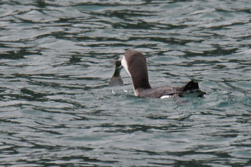 港湾で観察を始めると同時に天気が急変。強い風と雨模様になった。港湾内にはカルガモの姿しかなかったが、風波が強まるとオオハムが入ってきて採餌行動を行った。捕らえた大物はスズキの幼魚セイゴのようだった。